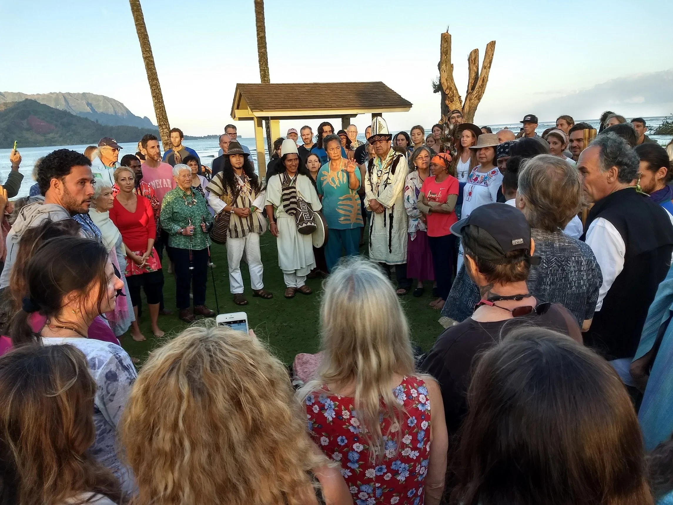13 Indigenous Wisdom Weavers from tribes around the world gathered on Kaua'i in 2017. When we reconvened in 2022, the Council of Indigenous Sages of Colombia called for synchronized global ceremonies—and we responded by creating our monthly New Moon gatherings connecting wisdom keepers across continents.